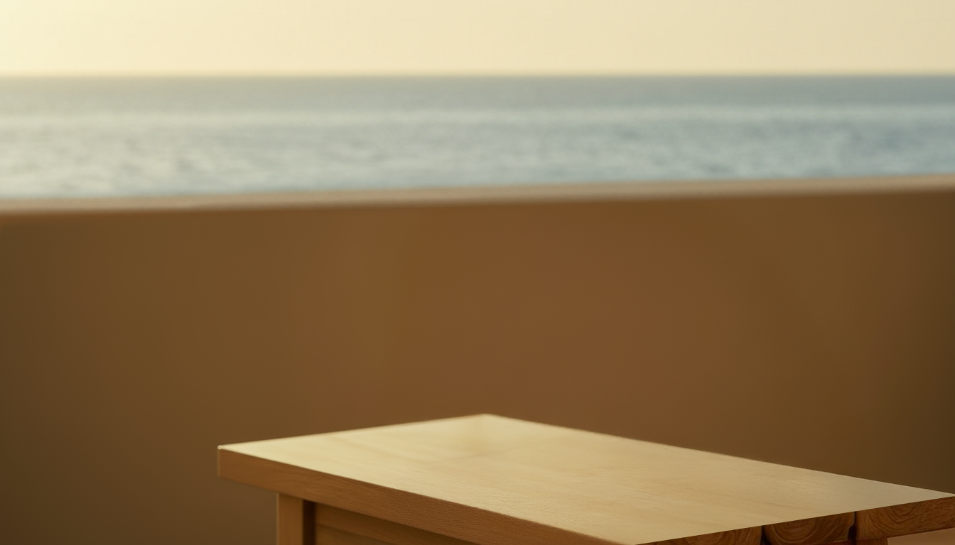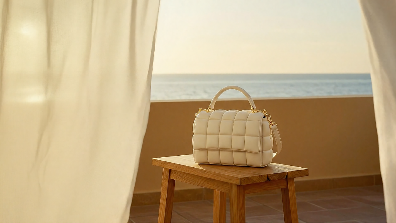 Prompt: As the white linen curtain slowly settles from its flutter, the medium-sized rectangular handbag with oversized padded grid texture, crafted in smooth glossy white taupe leather with a subtle reflective sheen, rests quietly on a smooth glossy wooden stool chair. Sunlight glows softly across its plush square panels and rounded gold rings, while a gentle coastal breeze drifts through the terrace. Then, with calm intention, the bag begins to lift — not abruptly, but in a slow, graceful motion, guided by a bare hand and arm with no clothing or sleeves, moving tenderly and with care. The soft shadow of the hand glides across the leather as it lifts, and the strap sways delicately, catching the warm golden light before leaving the frame. The camera performs a slow, continuous zoom-in while the bag is gently lifted, enhancing the sense of closeness and elegance. Every motion unfolds softly and unhurriedly, evoking a cinematic calm and refined coastal serenity. Photorealistic, 4K, | |