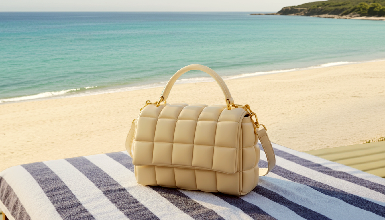 Prompt: The camera eases to a stop, holding a wide, tranquil view of the terrace overlooking the sea. Gentle waves move below, their soft rhythm blending with the hush of coastal air. The striped towel on the sun lounger subtly stirs in the breeze, a hint of motion against the stillness. As the camera begins a slow, dramatic zoom-in, a bare hand enters gracefully, moving with quiet precision to place a medium-sized rectangular handbag with an oversized padded grid texture, crafted in smooth glossy white taupe leather, onto the towel. The rounded gold rings catch glimmers of daylight as the bag settles into place. The zoom continues just slightly closer, resting in serene focus on the composition — the textures, the light, the sound of the sea — photorealistic in 4K, elegant and complete, a cinematic close to the story. | |