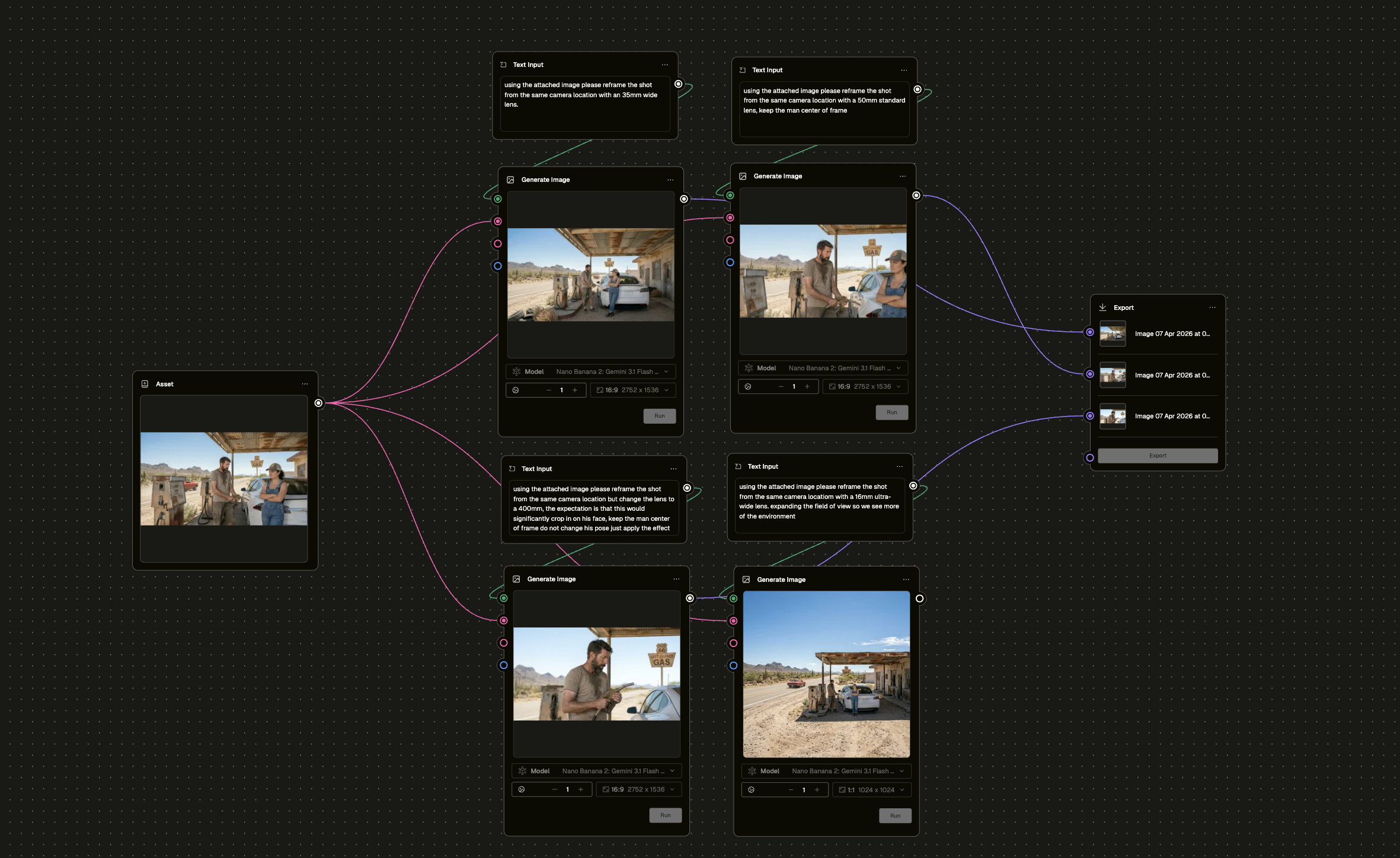 In this module, we built a workflow around a single base image, then branched it out across multiple lens prompts running in parallel. One scene. Multiple perspectives. All generated from a single asset node.
