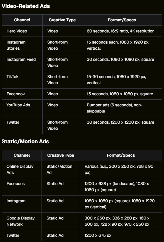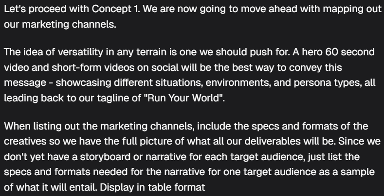 Step 3B: Campaign Idea Agent - Marketing Channels Staying in the Campaign Idea Agent, we now move towards defining the appropriate marketing channels, which also helps us to establish the project's deliverables. This part is all about determining the most appropriate channels and formats, such as static imagery or videos. Prompting Tips: Specificity in Channel Selection: If you know which channels you will utilize, list them and request the number of assets and their formats. This clarity helps tailor the strategy to the project’s needs. Comprehensive Asset Overview: Specify the number of creative assets required per target audience or persona. This approach provides a more comprehensive understanding of the total assets needed. Once you've selected and possibly refined your concept to suit the brief, identify the most suitable platforms and formats. Here are some ways to prompt the agent:
