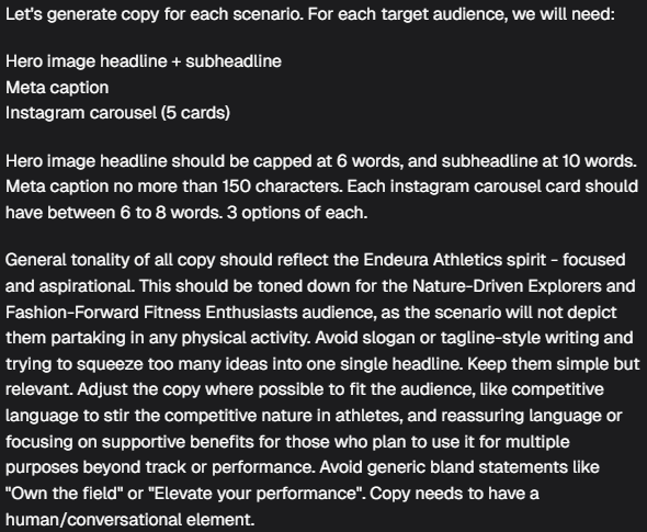 Once insights, audience personas, concepts, and visual development are done, you come into the final stretch with copy generation. The importance of specific and clear feedback cannot be overstated; understanding what doesn’t work, why, and how to correct it is essential for achieving high-quality outputs. Prompting Tips: Set Parameters Upfront: Establishing word or character limits from the beginning helps ensure drafts meet specifications, avoiding the need for later adjustments. Reinforce Tone of Voice: Even when documented, reiterating your brand's Tone of Voice within prompts is vital to prevent the LLM from generating generic outputs. Consistency in style is key. Highlight Do’s and Don’ts: Clearly specify what to include in the copy as well as what to avoid. Negative examples can be as instructive as positive guidelines. Defining What Is Good: Providing examples of exemplary copy (three to five is ideal) can further refine the LLM's understanding of what good content looks like. This added context aids in generating more targeted and nuanced results. In general, copy prompts should address two main aspects: 1. Requirements: Specify the number of options needed, platforms, and character or word limits. 2. Instructions: Outline tone, language, style, or formatting. Detailed instructions significantly impact output quality, ensuring it aligns with brand expectations. Rectifying "AI Copy" Characteristics: Initial copy drafts often exhibit markers of artificiality—overuse of vague abstractions, forced alliteration, crammed ideas, and dual two-word phrases. Overcoming these involves providing feedback, such as specifying the need for concrete benefits, action, and context over abstract metaphors. Sample feedback prompts: