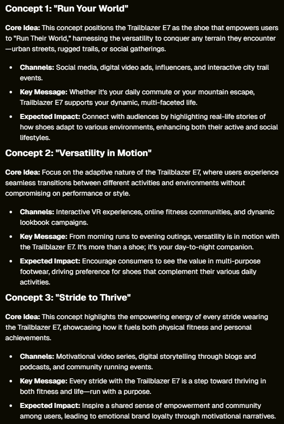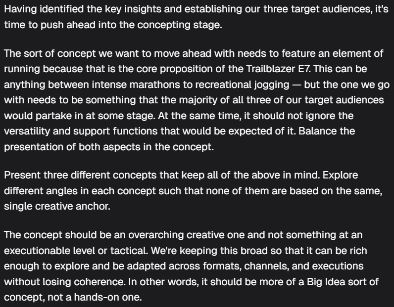 “The concept should be an overarching creative one and not something at an executionable level or tactical.” Setting Parameters: Clearly establish any compulsories or requirements for the concept. This maintains realistic boundaries that align the output with both the brief and the target audience. If there are no creative limitations, encourage a broader range such as: “We do not have any creative limitations, so feel free to explore a broader range of ideas, and include some potentially unconventional ones.” Ensuring Unique Concepts: Scratch beneath the surface and you may find that some concepts are generated based on the same idea or creative insight. You can avoid this by telling the agent you want all concepts to be distinctly different, with each one based on a different insight. Tightening It Up: Concepts might initially be unpolished, missing out on key unique selling points or focusing on secondary features. Guide the agent back on track with prompts like: