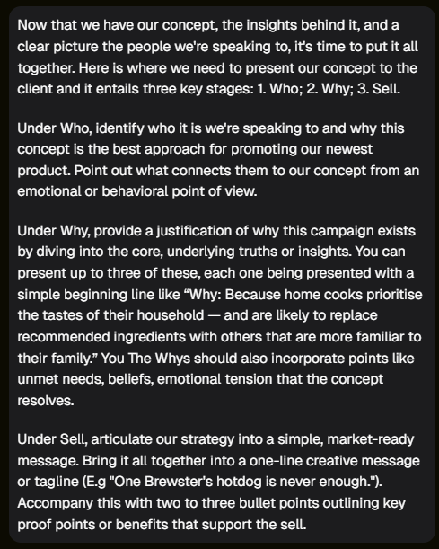 Step 3C: Campaign Idea Agent - Who, Why, Sell You’re convinced that you’ve got an amazing concept that the client will love. But do you know that for sure? The "Who, Why, Sell" framework will help you improve the odds of winning them over with your concept. By tying the insights, target consumer personas, and concepts together, it provides proof that the idea you’re presenting is grounded in what matters to the brand and to the people you’re trying to reach. Here’s what we are looking to achieve in this phase: Who: Mapping identified marketing channels directly to target audiences, ensuring alignment with their media consumption habits and behaviors. Why: Articulating the appeal of the concept, demonstrating its relevance and resonance with the target audience on a deeper level. Sell: Highlighting and connecting essential product or service benefits and features to the target audience’s needs and preferences. Prompting Tips: Segmented Instructions: Clearly delineate instructions for each aspect of Who, Why, Sell. Each serves a distinct purpose and requires tailored guidance. Formatting for Readability: Specify that the output is intended for a pitch or slide deck, prompting the learning model to present the information in a structured, easily digestible format. Expanding on the Why: To further build a case for your concept, you can tell the agent that the Why needs to answer a number of questions. For instance: