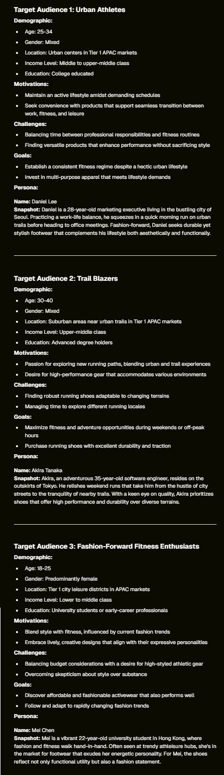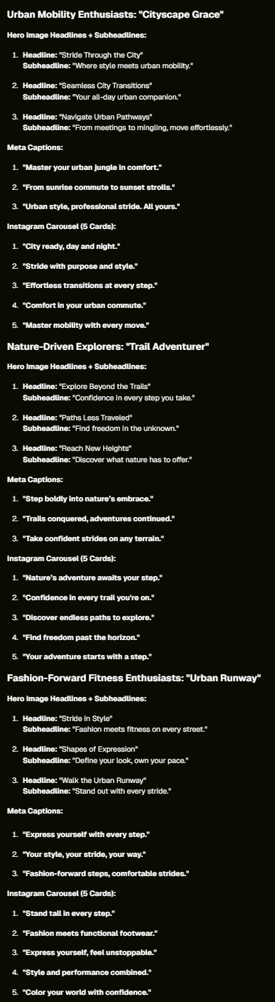 a. “We do not want to focus on the aesthetics, but the memory foam and cushioning. The concept should centre around this aspect.” b. “The concept may not resonate as strongly with one persona. Change the core idea and/or description to ensure it touches on the motivations and challenges faced by all three of them.” c. “The core insight of needing the shoe to support both athletic and leisurely activity is not reflected strongly enough. Rework the concept and title so that it better reflects both the target audiences’ desires or needs, and the foundational benefit of the product.” | |